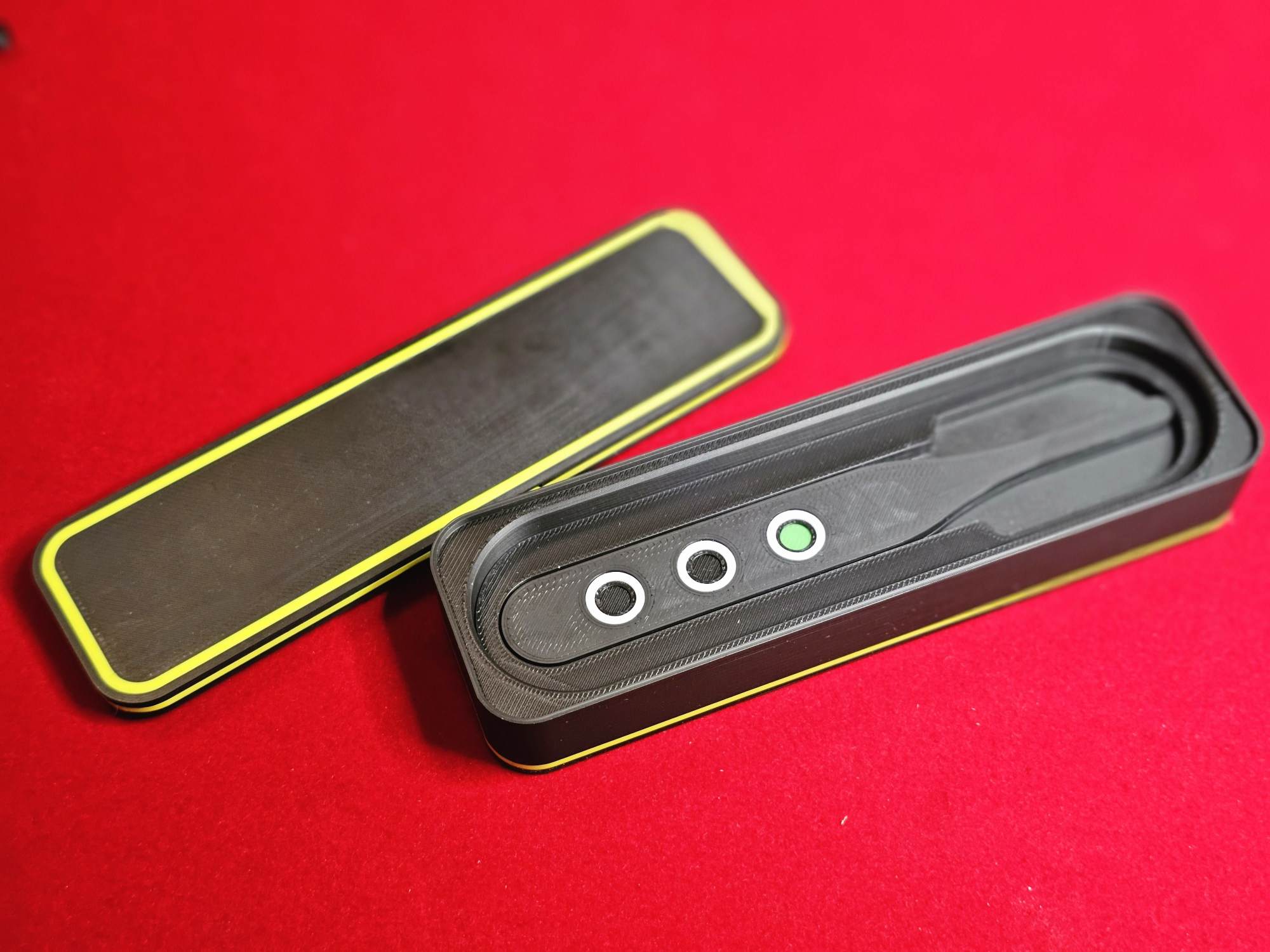 Auf der Basis der Funktionsweise einer Kartenkassette habe ich diese Austausch-Box konstruiert. Sie dient dem Austausch der Kelle „Sicherer Schulweg“ in eine untersuchbare Kelle mit gleichem Aussehen.