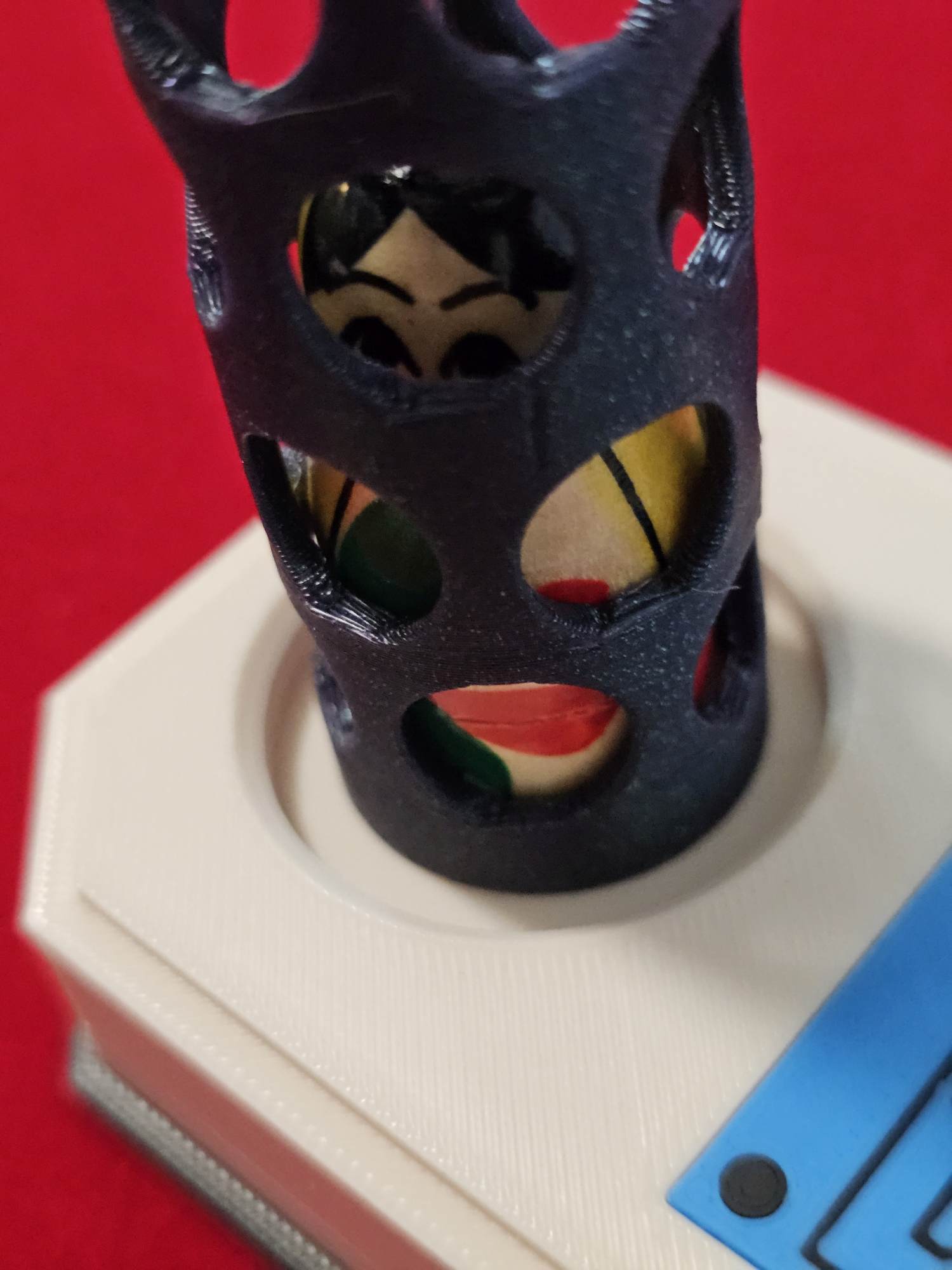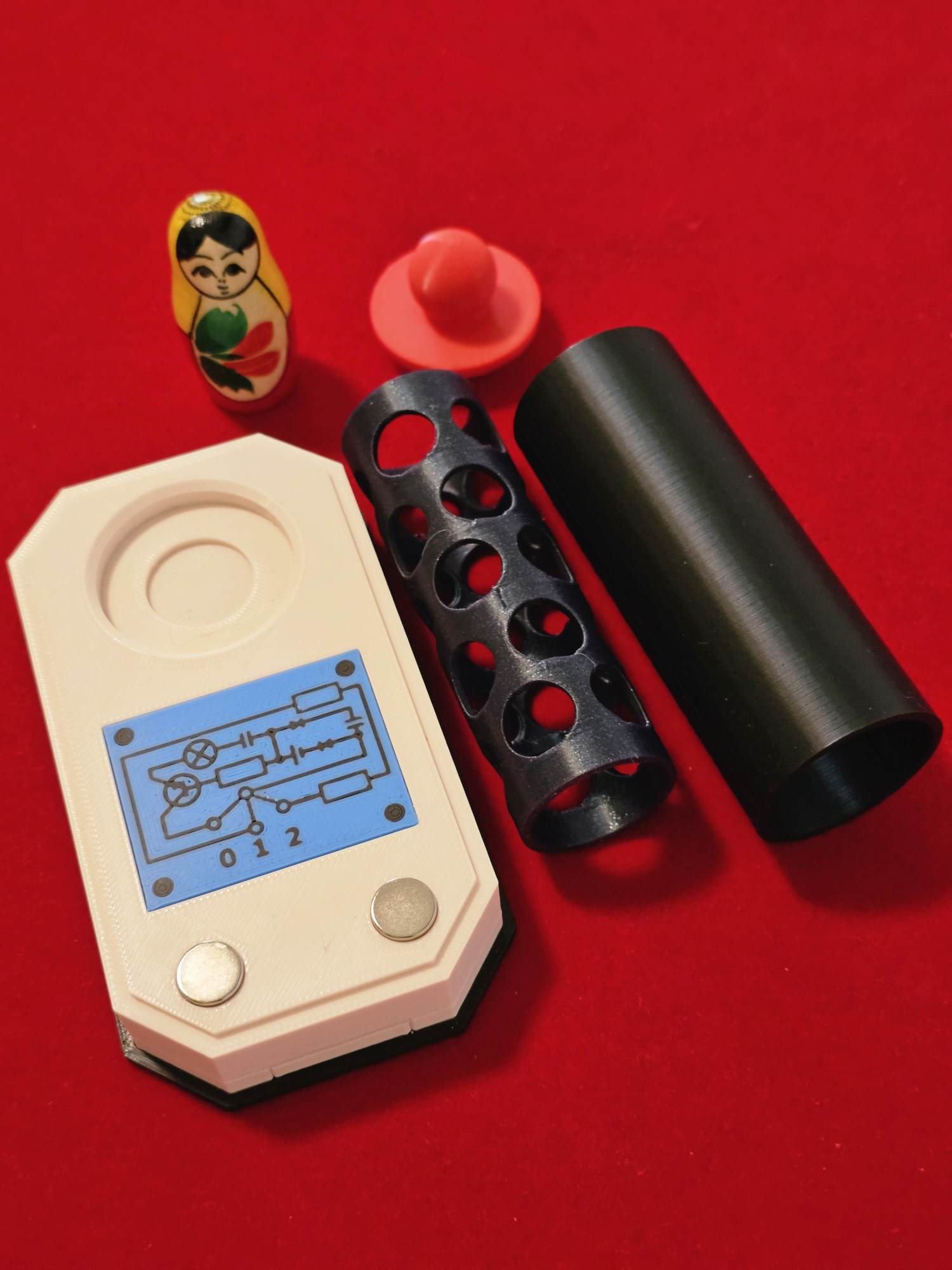 Babutschka stellen Sie nun auf die Plattform und stülpen über die Puppe eine total durchlöcherte Röhre. Babutschka ist also immer noch sichtbar, aber bereits jetzt vor jedem Zugriff abgeschirmt. Um die Zuschauer vor den gleich auftretenden gefährlichen Strahlungen zu schützen, geben Sie über die Lochröhre nun noch eine zweite, normale Röhre, die oben mit einem Holzdeckel verschlossen wird.