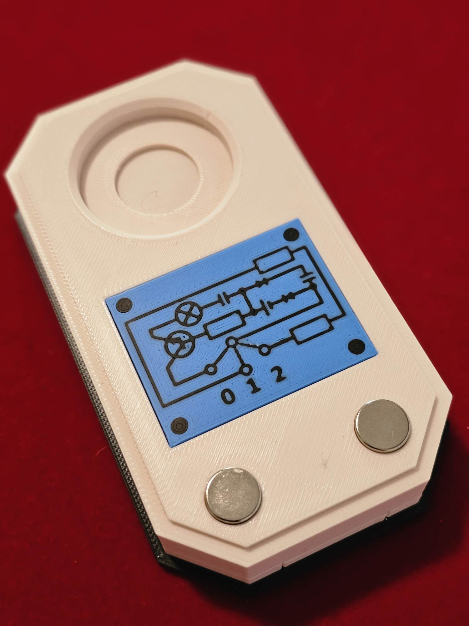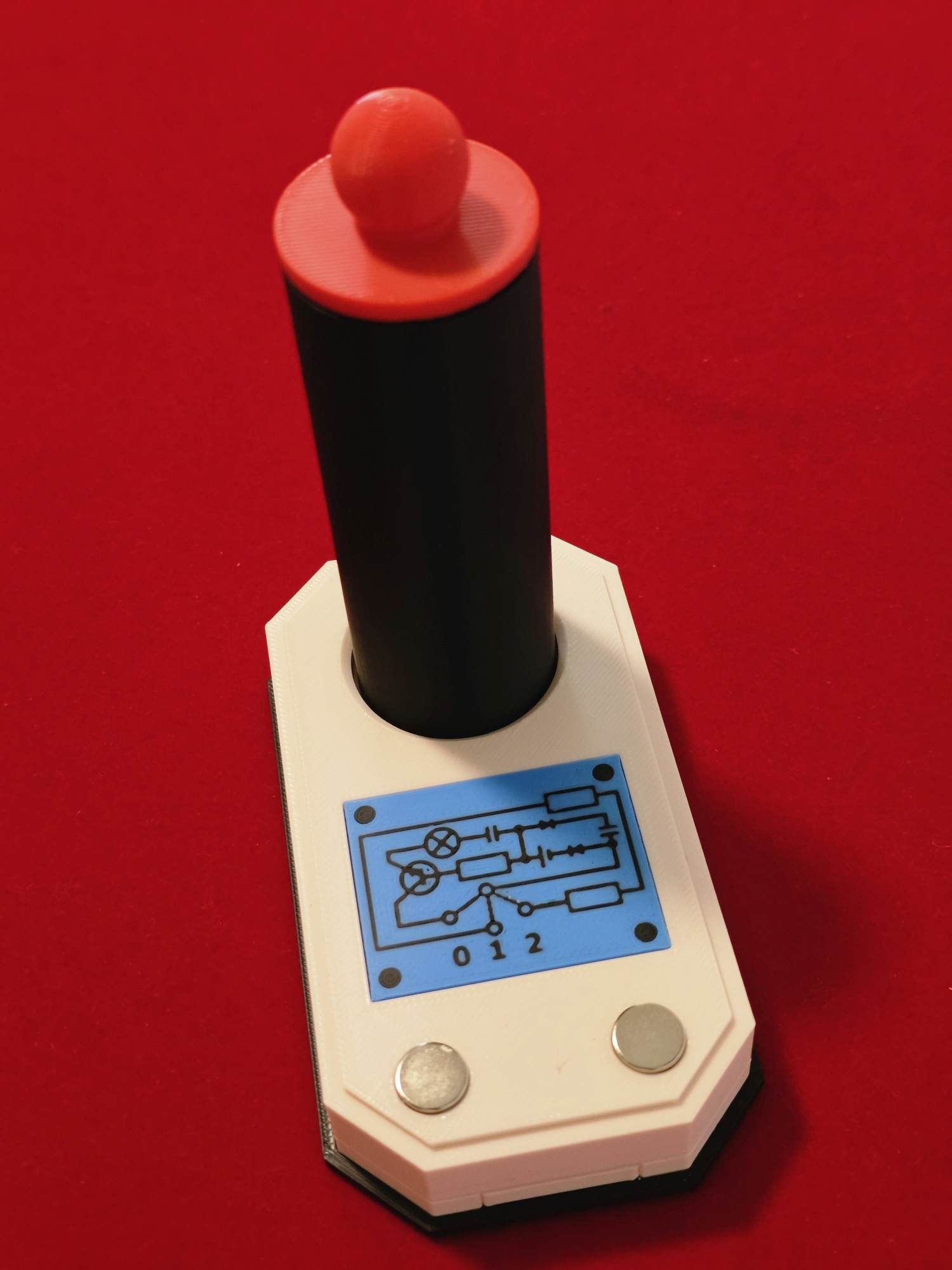 Der Vorführende zeigt den Zuschauern ein sehr schön gefertigtes Podest vor, auf dem sich eine kleine Plattform befindet. Darunter ist eine komplizierte elektronische Schaltung zu sehen und am Ende befinden sich noch zwei Schaltknöpfe.